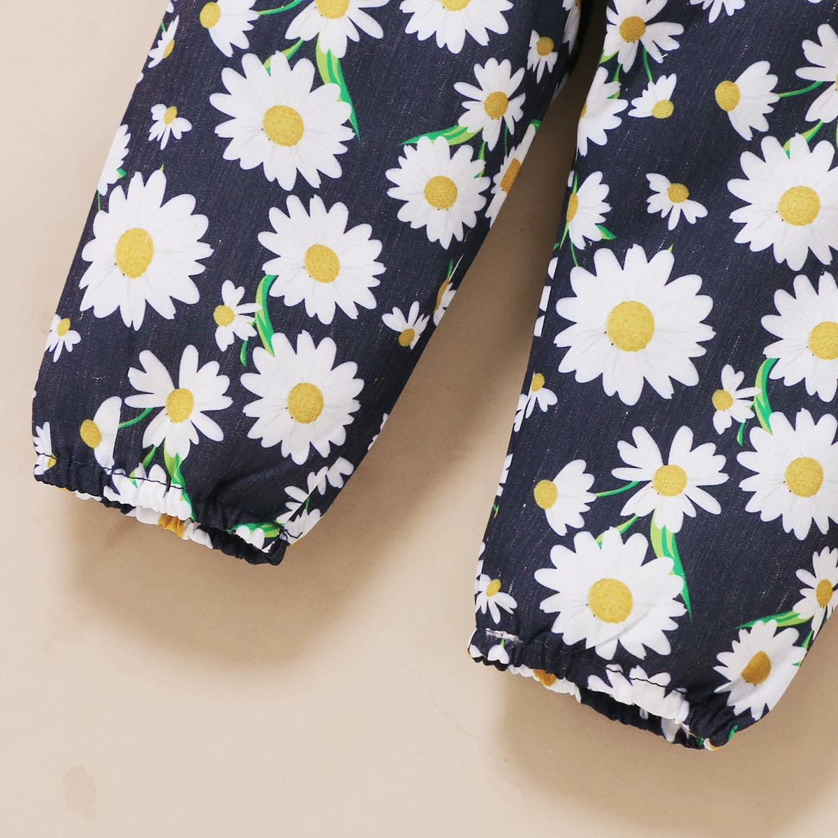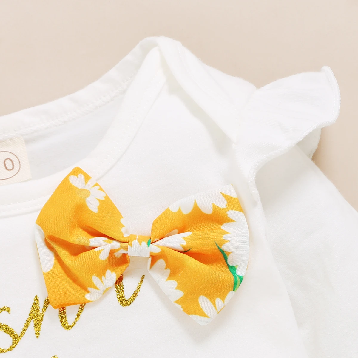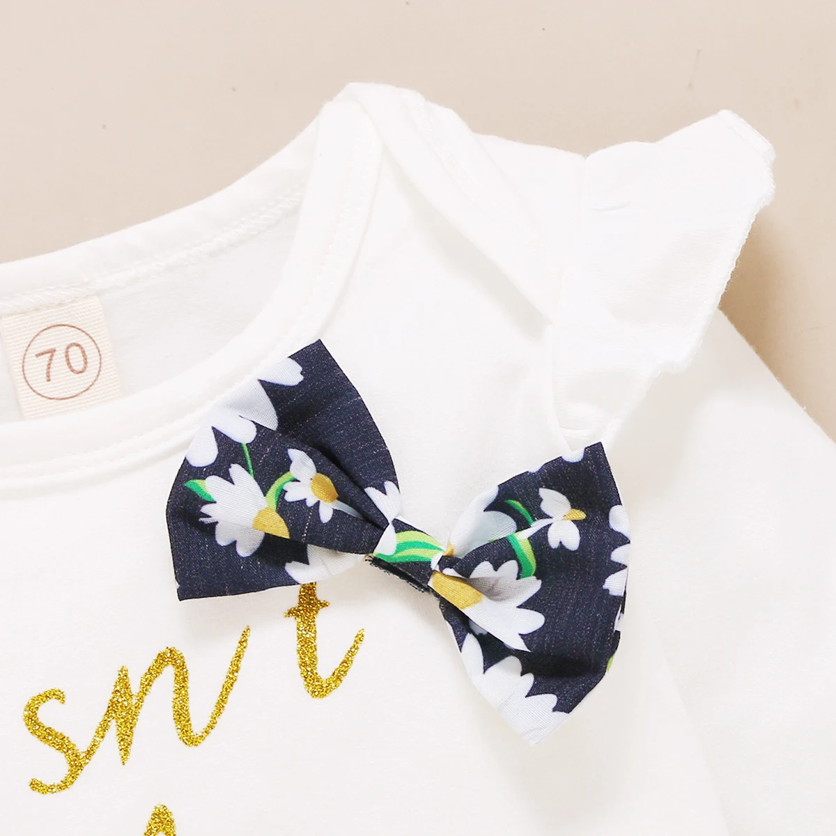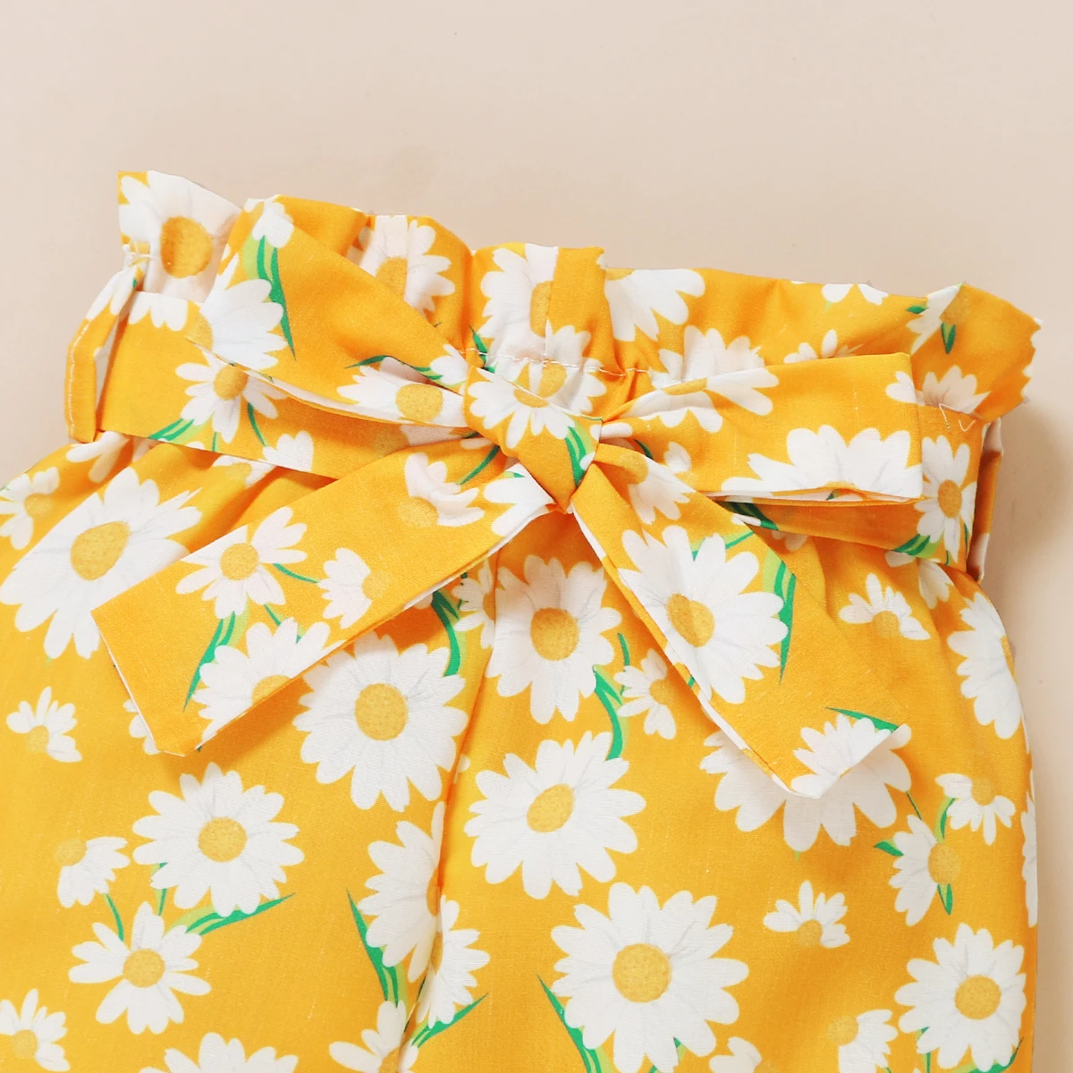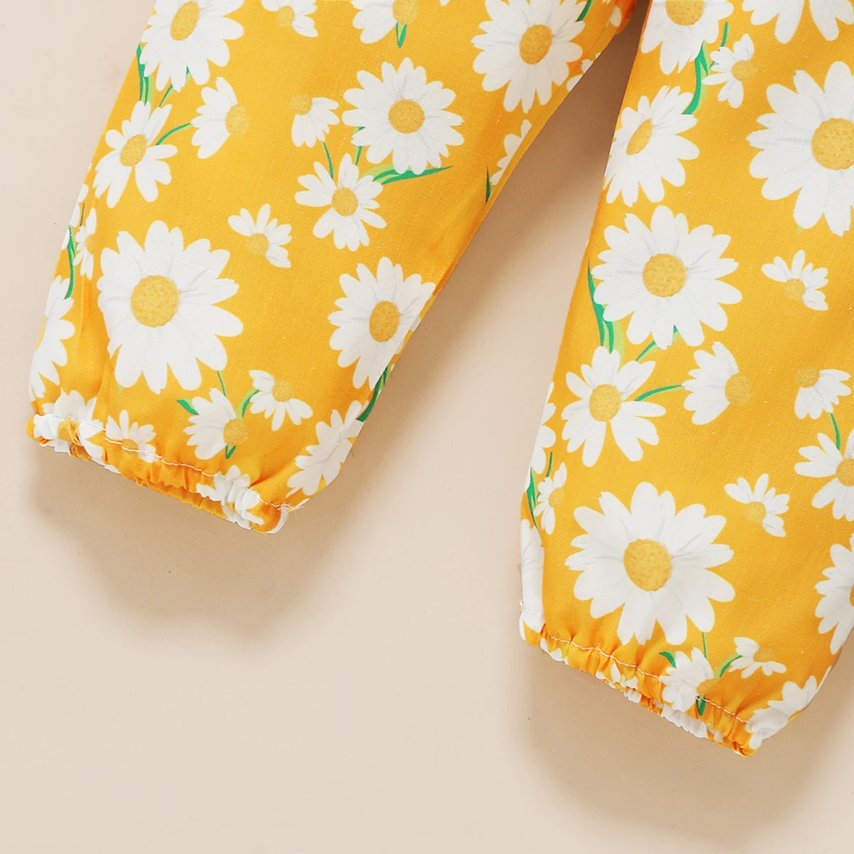 Комплект одежды из 3 предметов для маленьких девочек, комбинезон с оборками и длинными рукавами, на пуговицах, длинные штаны с поясом и ромашками, комплект с лентой для волос с бантом