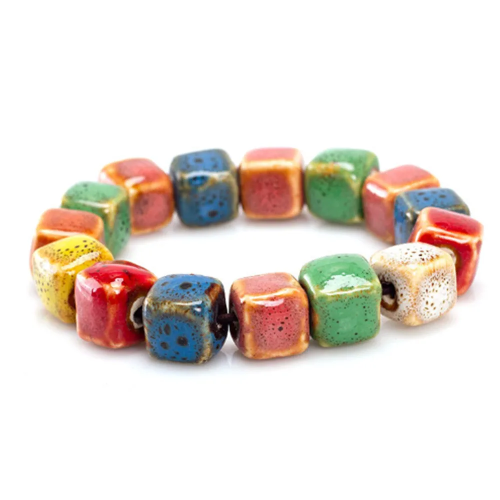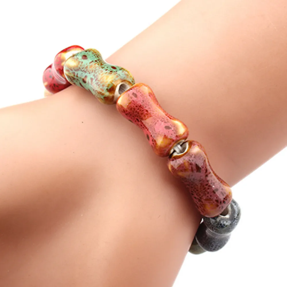 Разноцветные бусины с леопардовой глазурью в национальном стиле ручной работы, керамический растягивающийся браслет SZ202