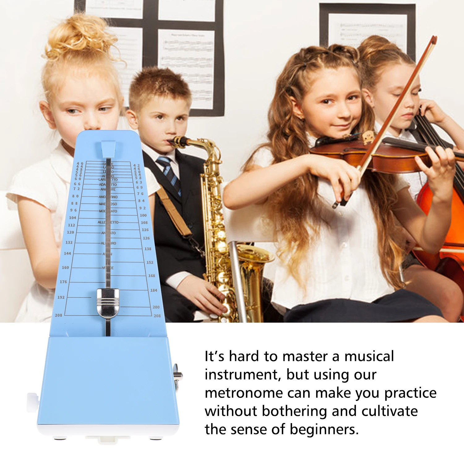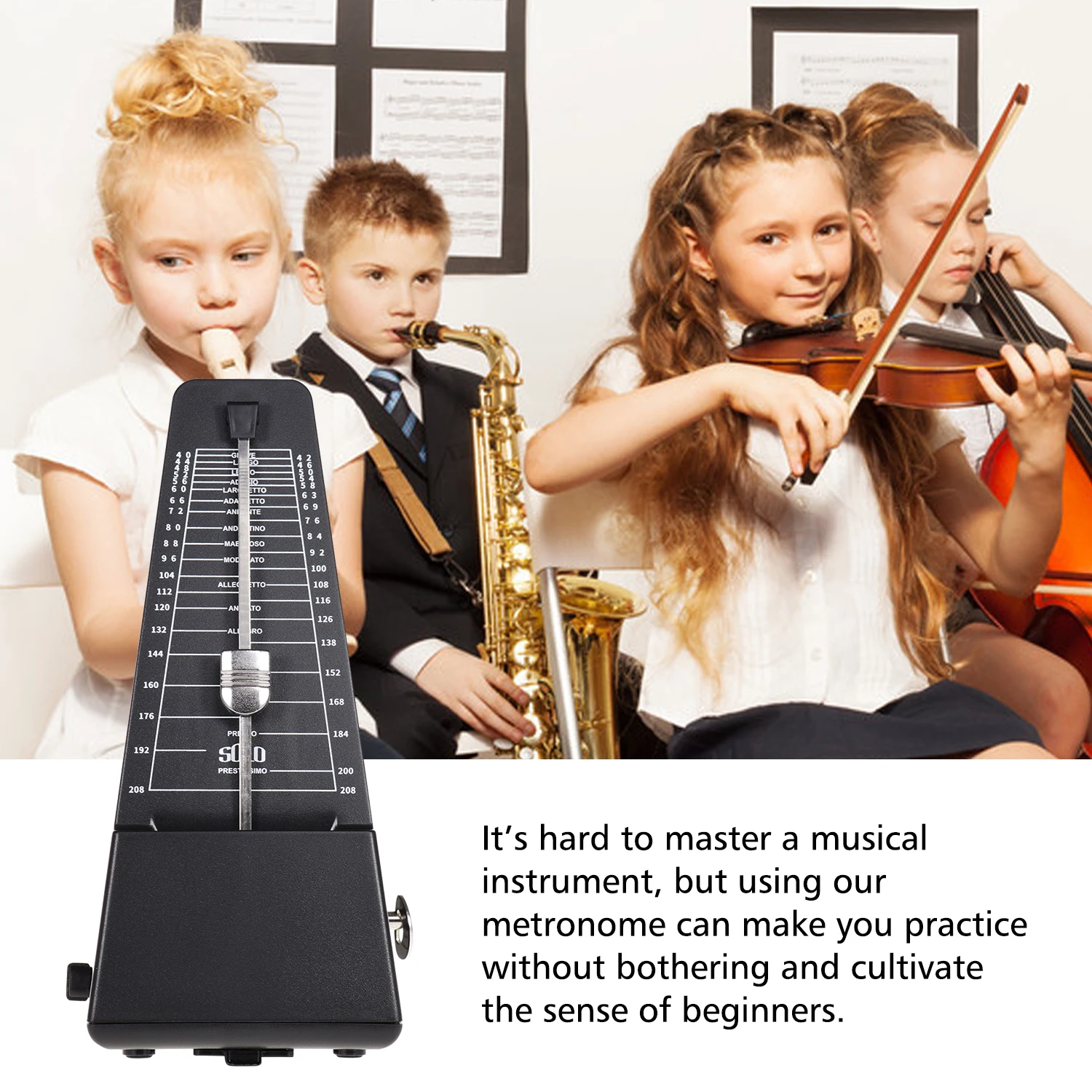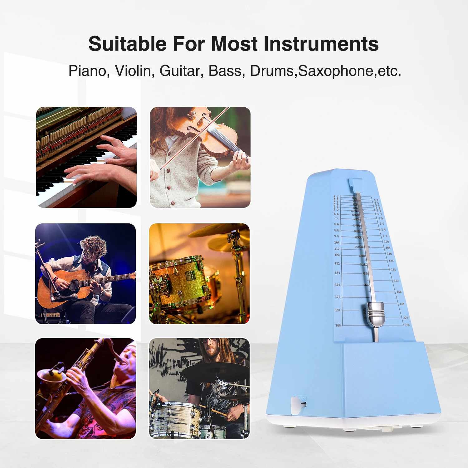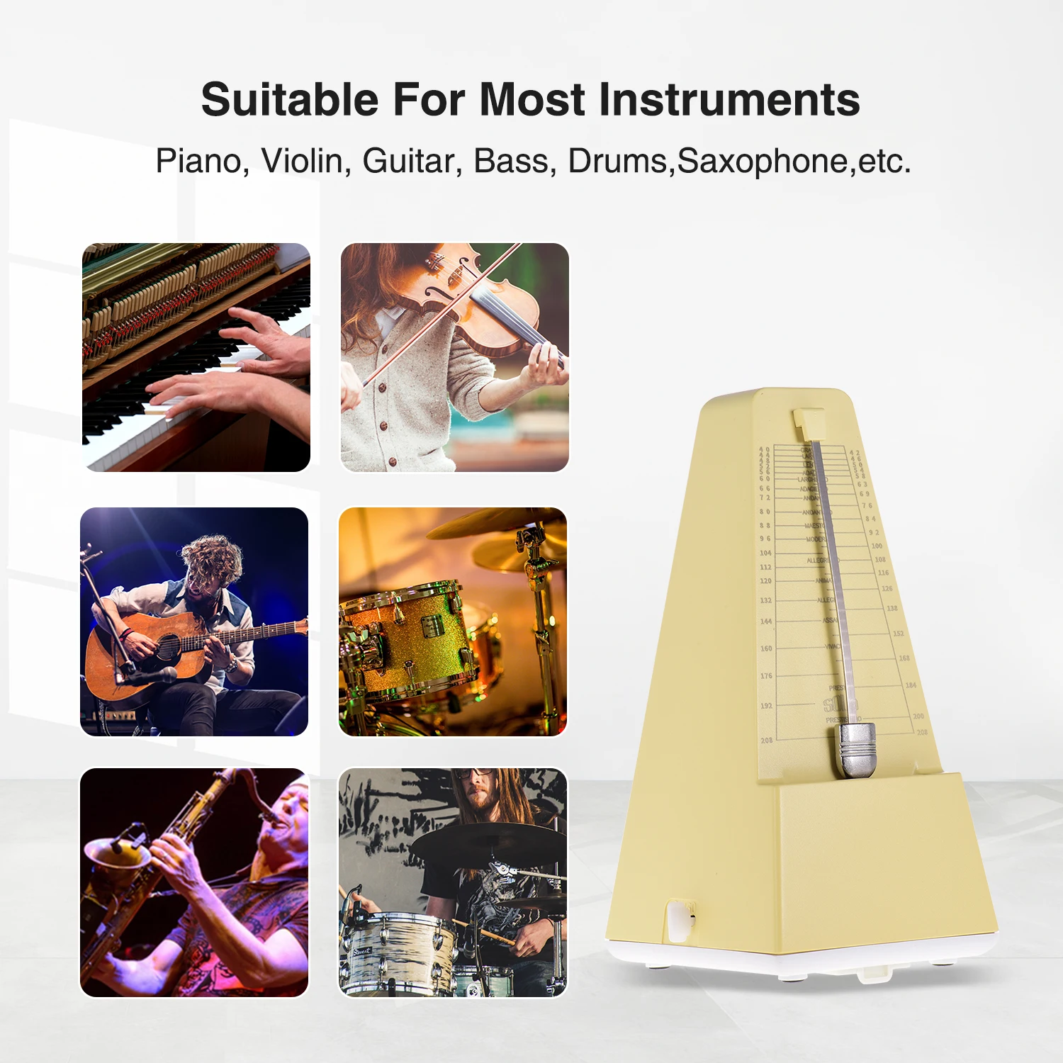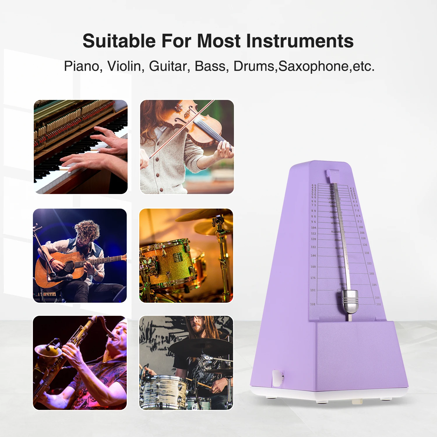 Универсальный Механический Метроном подходит для большинства музыкальных инструментов, таких как гитара, бас, пианино, скрипка, барабан и т. д.