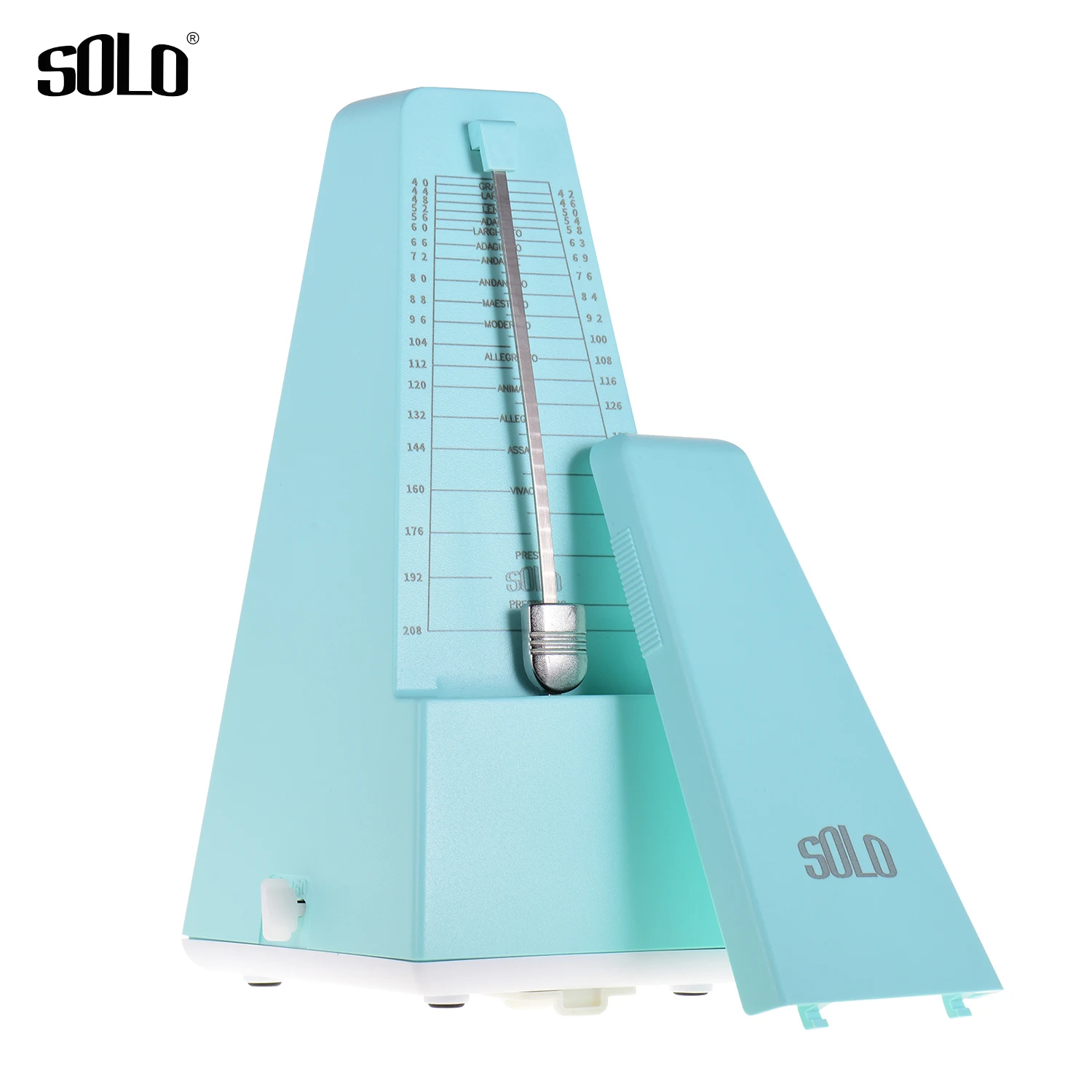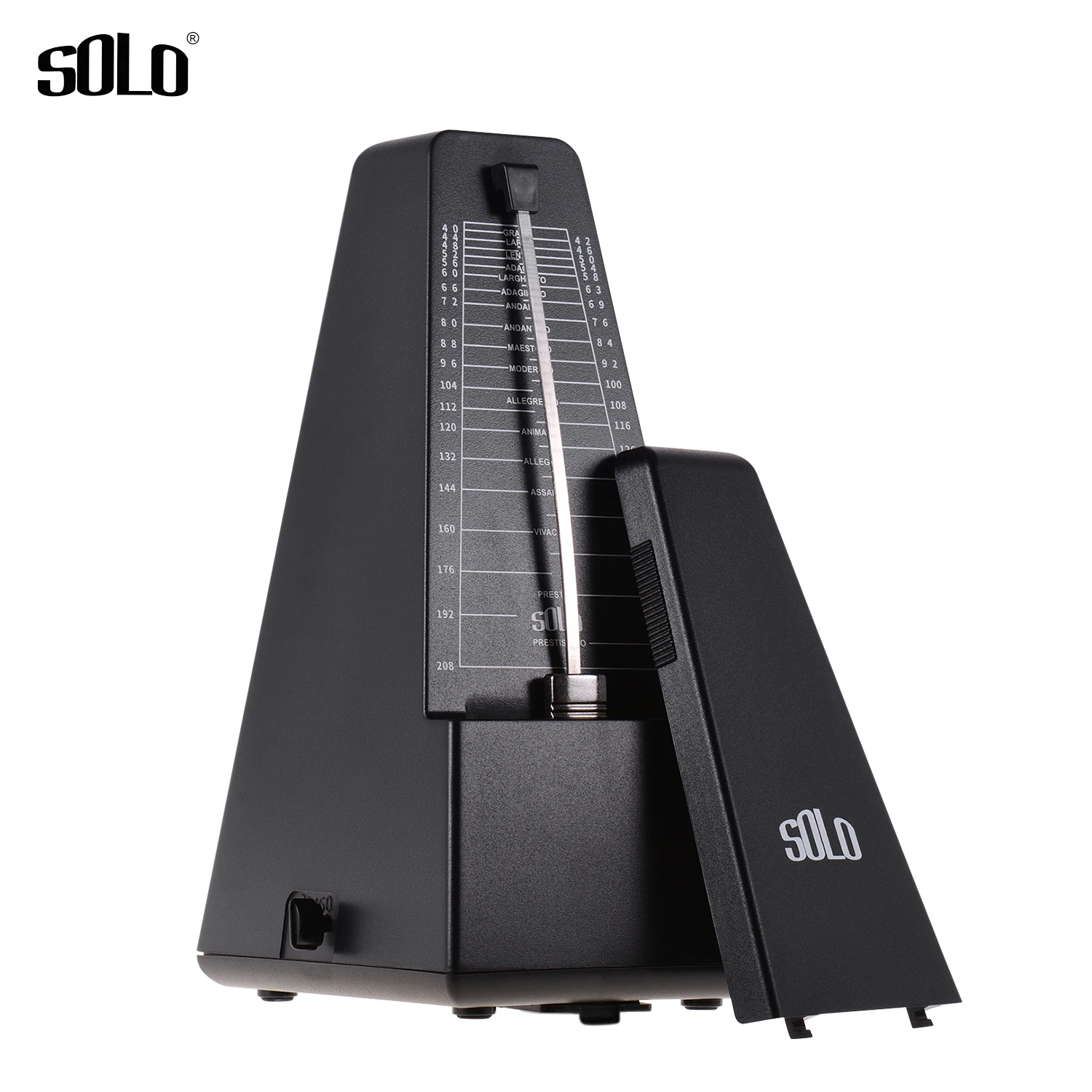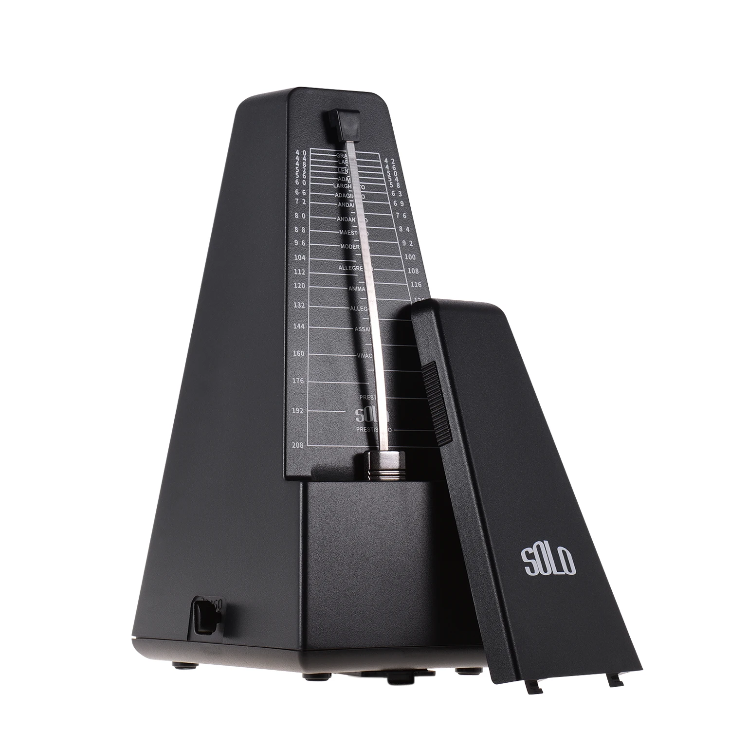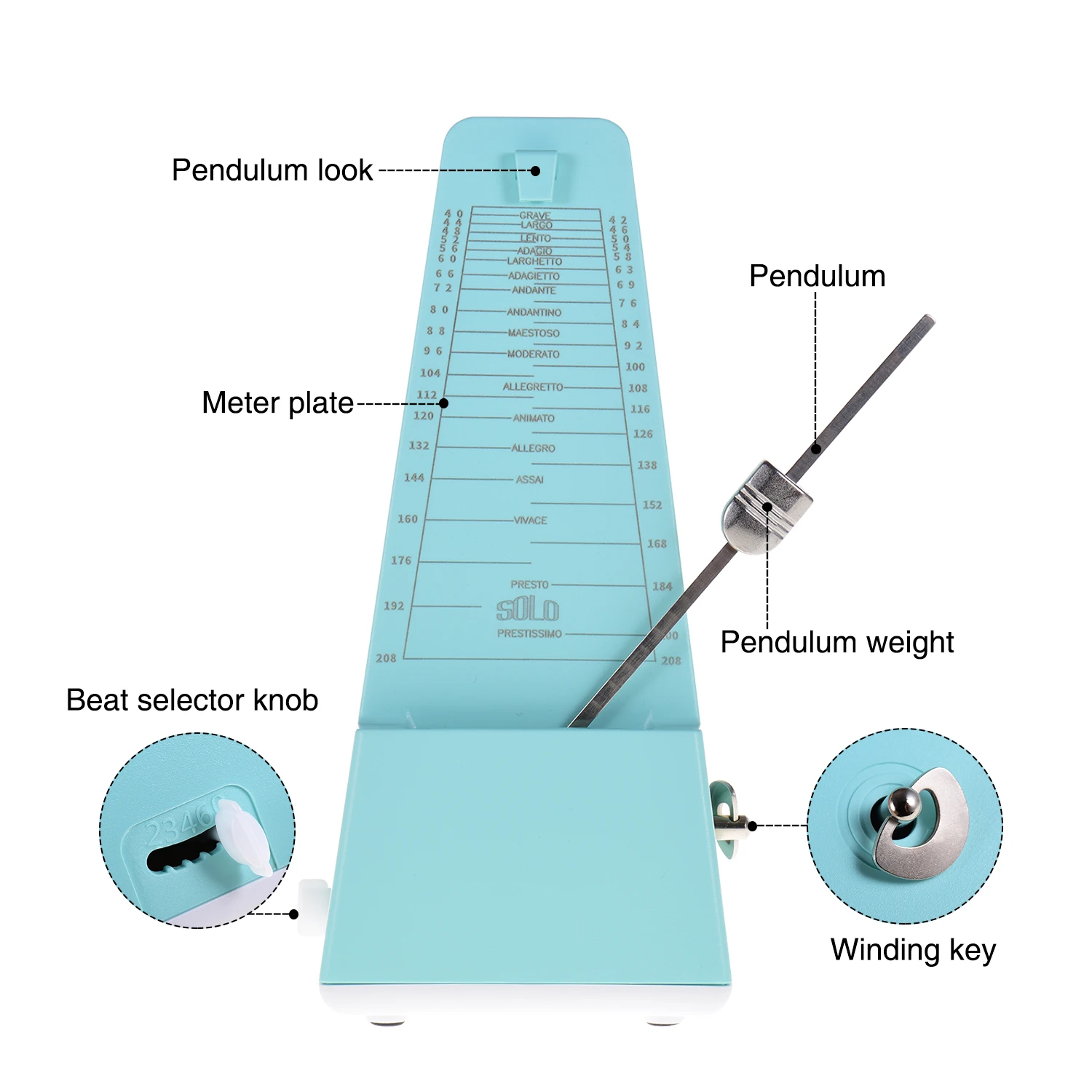Простой в использовании, сначала намотайте его, затем выберите желаемый ритм (2/3/4/6/0) и темп (40-208 bpm), наконец снимите крышку и установите маятник в движение. Вы можете сползти вверх или вниз по весу на стержень маятника для регулировки скорости в соответствии с таблицей счетчика.