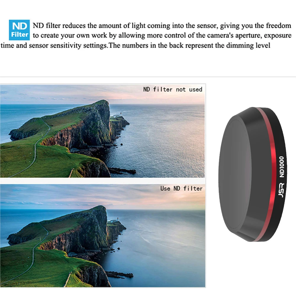 ND фильтр уменьшает количество попадания на светильник в датчик, давая вам свободу создавать свою собственную работу, позволяя больше управлять диафрагмой камеры, временем экспозиции и настройками чувствительности датчика. Цифры в задней части представляют уровень затемнения.