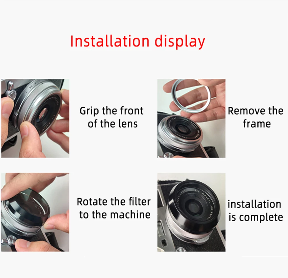Особенности 1. Процесс нанесения покрытия на светильник Принятие процесса затемнения покрытия, избегая проблемы традиционного изменения цвета зеркала ND, почти без литья цвета. 2. Двухстороннее многослойное нанопокрытие придает высокое качество водонепроницаемости, маслостойкости, анти-окрашивания и устойчивость к царапинам свойствам объектива. Подходящие модели: Подходит для камеры Fujifilm X100 Подходит для камеры Fujifilm X100F Подходит для камеры Fujifilm X100S Подходит для камеры Fujifilm X100T Подходит для камеры Fujifilm X100V