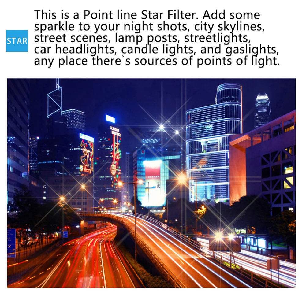 Это фильтр с точечной линией звезды, добавьте немного блеска в свои ночные снимки, городские skylines, уличные сцены, фонарные столбы, уличный светильник s, автомобильный головной светильник s, свечный светильник s, И газовый светильник s, в любом месте есть Точечный светильник.