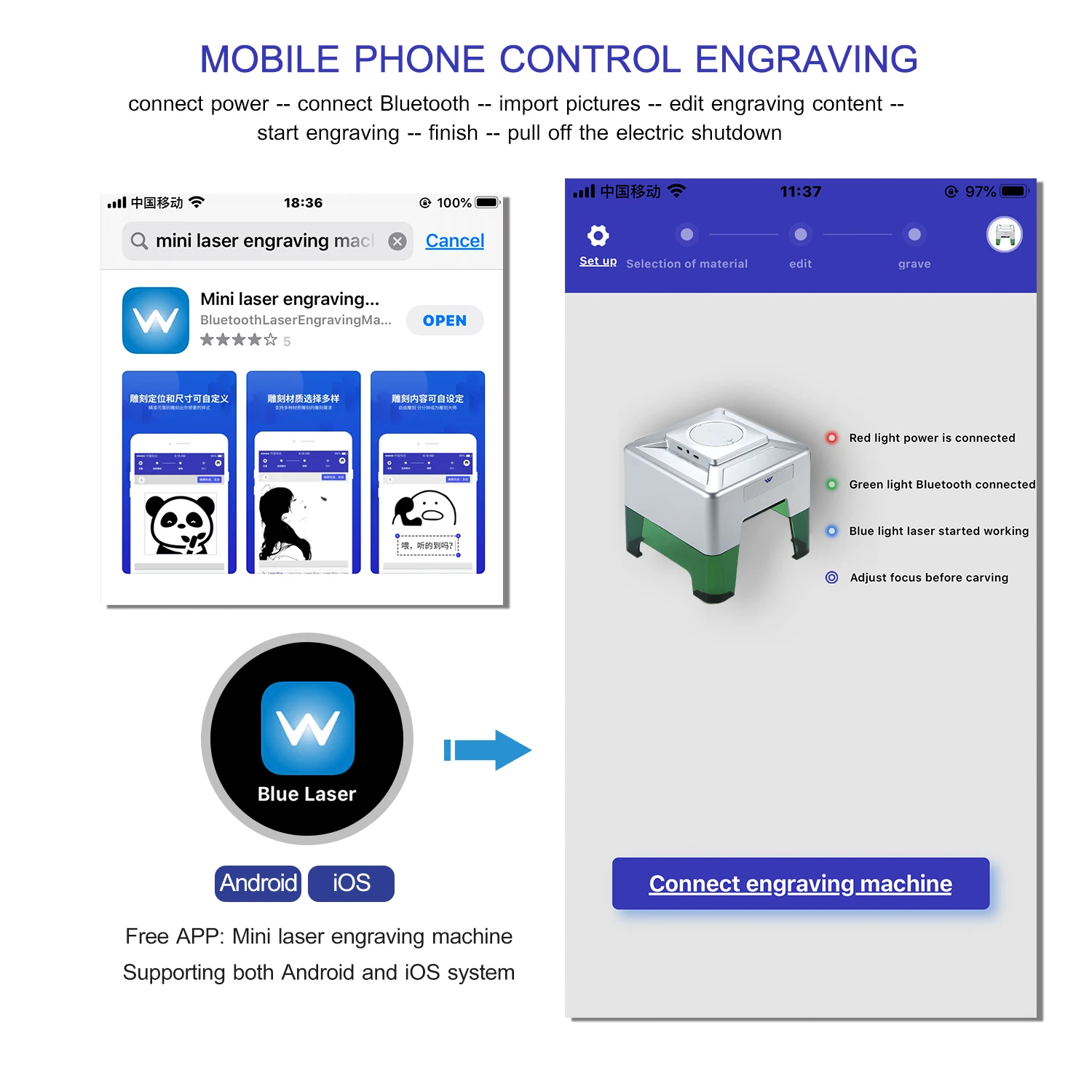 Смартфон Управление: Подключите лазерный гравер с мобильный телефон после того, как в паре с bluetooth для удобного передача данных, легко работать и Управление Линг через приложение. Бесплатное приложение (мини лазерная гравировальная машина), поддерживает Android и iOS систему.