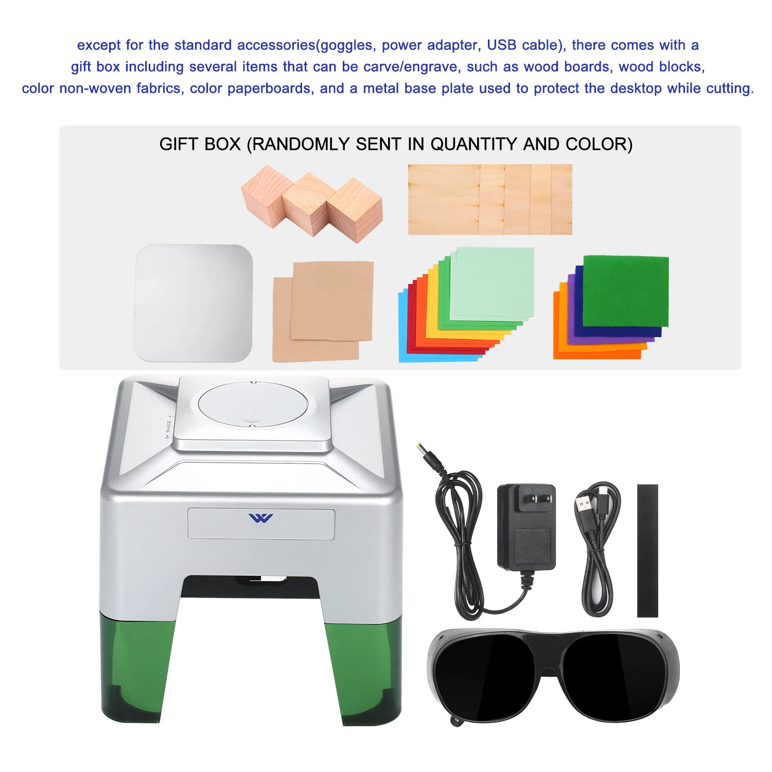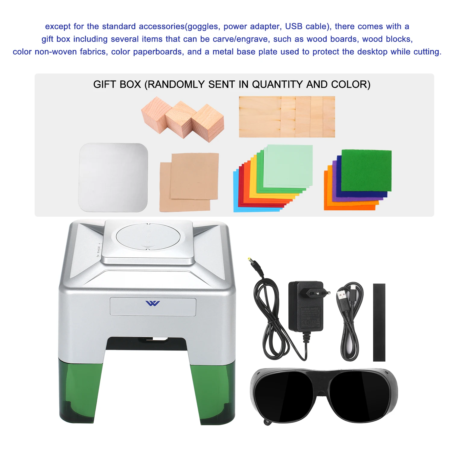 Подарочная коробка: за исключением стандартных аксессуаров (очки, адаптер питания, USB кабель), поставляется с подарочной коробкой, включая несколько предметов, которые могут быть вырезаны/выгравированы, таких как деревянные доски, деревянные блоки, цветные нетканые ткани, цветные картон и металлическая Базовая пластина, используемая для защиты рабочего стола во время резки.