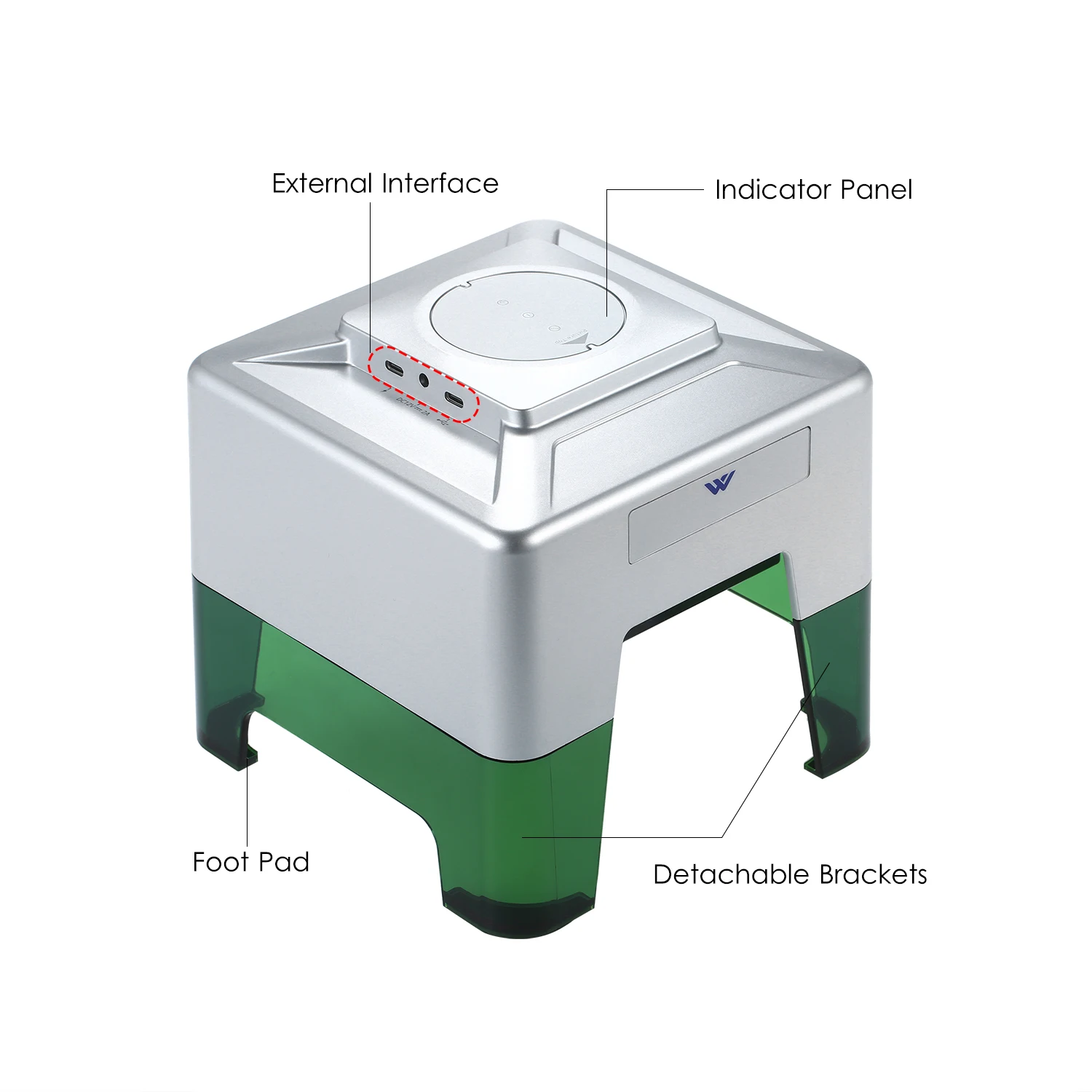 Светильник индикатора: Красный светильник означает, что источник питания подключен, зеленый светильник указывает на то, что устройство подключено, И синий светильник свидетельствует о том, что Лазерная начинает работать (в тех случаях, когда синий индикатор не светильник s, и есть слабый Светильник Спот излучаемого Это для регулировки фокуса и предварительного просмотра положения гравировки).