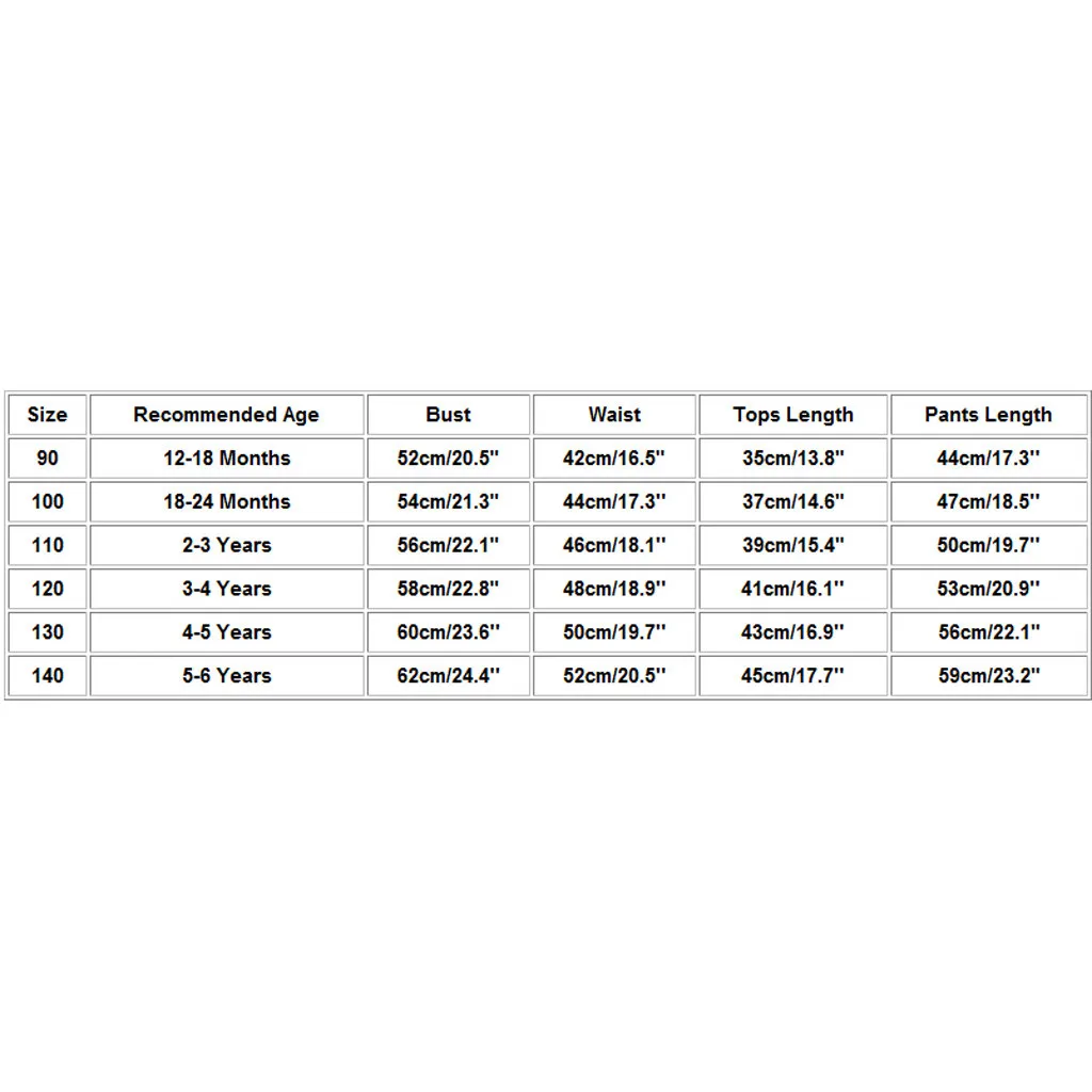 Размеры Рекомендуемый возраст Обхват груди Обхват талии Топы Длина Брюки Длина 90 12-18 месяцев 52 см/20,5" 42 см/16,5" 35 см/13,8" 44 см/17,3'' 100 18-24 месяцев 54 см/21,3" 44 см/17,3'' 37 см/14,6" 47 см/18,5'' 110 От 2 до 3 лет 56 см/22,1" 46 см/18,1'' 39 см/15,4" 50 см/19,7'' 120 От 3 до 4 лет 58 см/22,8" 48 см/18,9'' 41 см/16,1'' 53 см/20,9'' 130 От 4 до 5 лет 60 см/23,6'' 50 см/19,7'' 43 см для ухода за ребенком для мам/16,9'' 56 см/22,1" 140 От 5 до 6 лет 62 см/24,4'' 52 см/20,5'' 45 см/17,7'' 59 см/23,2"