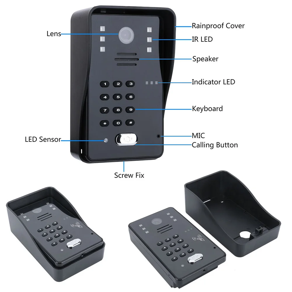 Наружная Камера:1. Датчик камеры: 1/3 "CMOS , 1000TV-Line2. Угол обзора: 92 °3. Определение: 1000TVL4. Ночное видение: ИК светильник5. Электронный замок: Поддержка6. Материал: панель ABS7. Водонепроницаемость: Поддержка8. Рабочая температура: -20 градусов + 60 градусов9. Установка: Настенный10. Размер: 190*95*55 мм11. Емкость пользователя: поддержка 2000 ID-карт, пароль