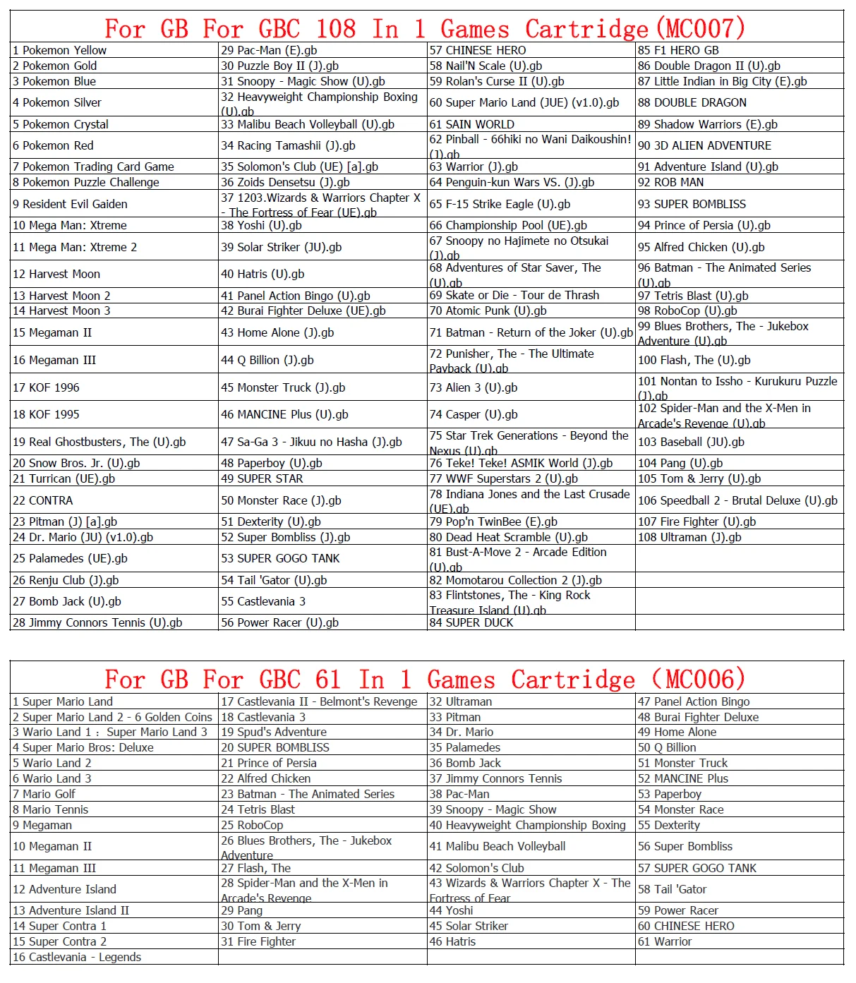 1. Эти любящие игры совместимы с консолями серии Nintendo для GBC для GBA для gba-sp. 2. Игры имеют функцию экономии батареи 3. Поддержка одной шт Прямая поставка. 4. Изготовлено на третьей вечерние фабрике 5. Отправка по Aliexpress стандартной доставки, быстрая и безопасная. 6, включает в себя две версии, 61 в 1 (MC006),108 в 1 (MC007) 7. Игры-это классические ретро-игры, включая gbc, для gb версии. Если вам нужно много или оптовые продажи или Прямая поставка, пожалуйста, свяжитесь со мной, чтобы получить скидку