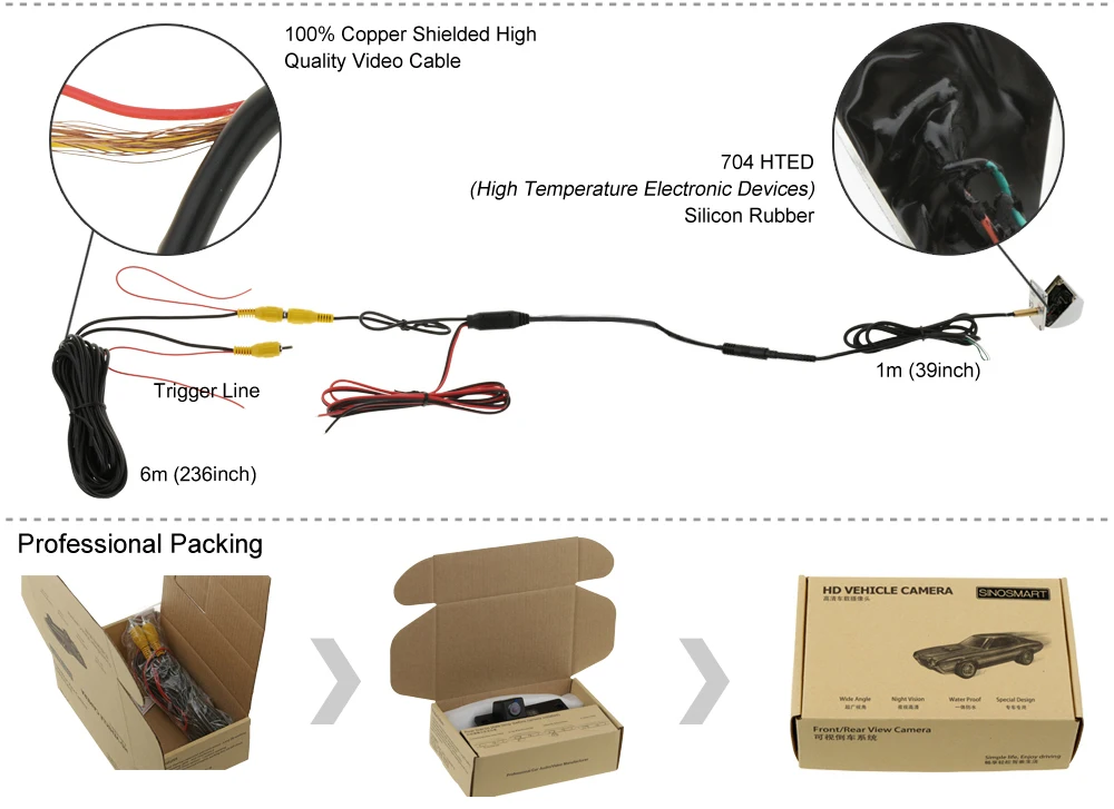 Lens materials: 100% Glass Optical format: Aptina MT9V136 Typical type: High-sensitivity mode for low-light conditions (Night Vision) Degree of protection: IP67 (Waterproof) System format: NTSC (Default), PAL(optional, please leave message to us if you need, free cost) Power supply: 6V/12/24VDC Wide Input Field view angle: 170deg (Diagonal), 138deg (H), 125deg(V) (more information from Option 2) Optical distortion: -88% (more information from Option 2) Horizontal resolution: 520TV lines (Pixels) Output: RGB 720H x 480V@NTSC, 720H x 582V@PAL Parking line: Manual Parking Line ON/OFF Image: Manual Switch Mirror & Normal Image Working time: Continuous working Operation temperature: -40°C to +80°C (-40°F to 176°F) Package Retail: gift box (available for camera size smaller than 15cm/5.9inch)
