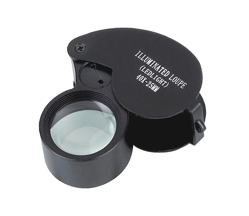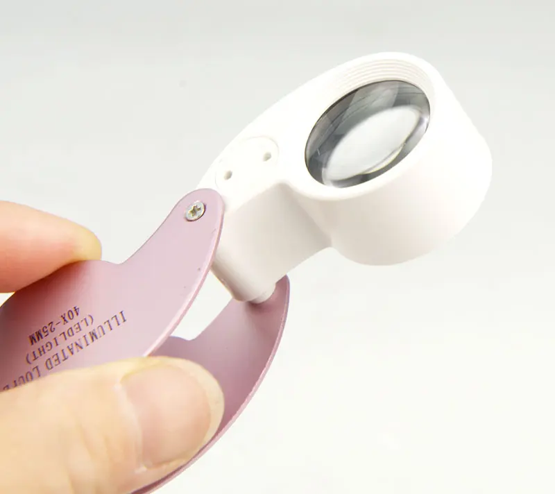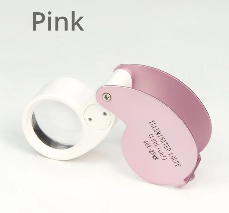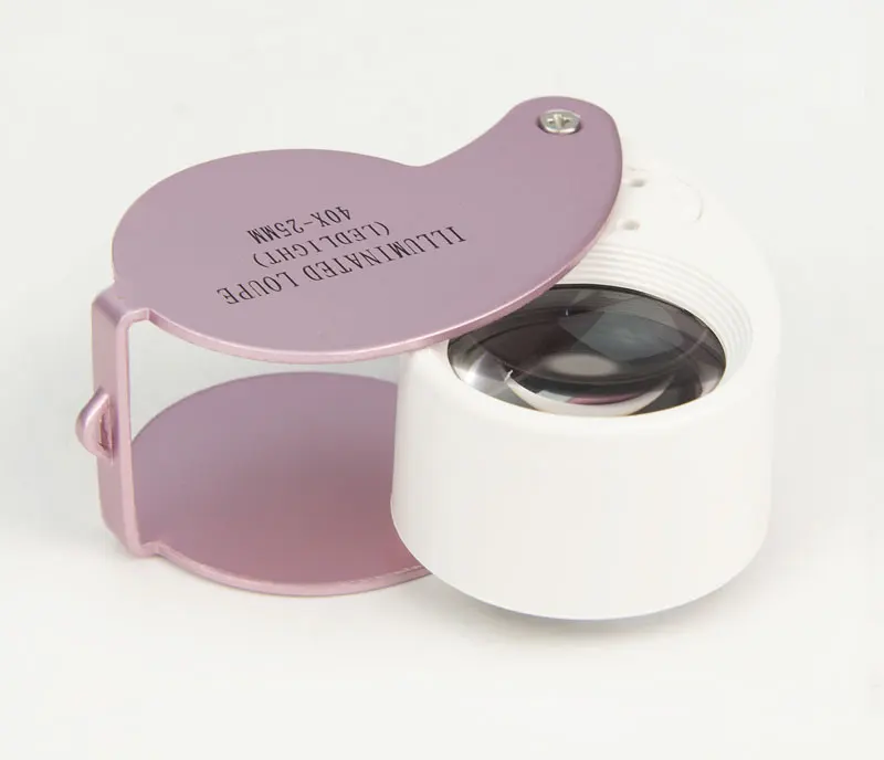 Особенности: 1) Лупа 40x с подсветкой и 2 светодиодными лампами, может использоваться в качестве фонарика в ночное время 2) Алмазная лупа со складывающейся конструкцией, легкая, брелок с перфорацией, удобная для переноски и использования 3) высококачественные оптические стеклянные линзы 4) яркий светодиод обеспечивает идеальный свет в любом состоянии 5) идеальное увеличение алмазной лупы 40X для обнаружения крошечных предметов 6) 3 цвета на выбор: белый, черный и розовый 7) продукт CE утвержден, фабрика ISO9001:2000 аудит