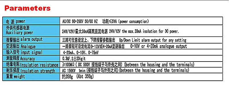 3 isolated 0-10mA transmitter or 4-20mA output, software adjustment provide 24V/12V, DC isolated power4 configured maximum 30mA RS232 or RS485 bus interface, optional MODBUS RTU protocol5 accuracy class ± 0.3% FS ± dight6 the instrument can measure a user given any range of AC and DC voltage / current signal, an optional data hold or peak hold function can be used for two-wire transmitter, pressure sensor, four-wire weighing sensor, remote pressure tables and other sensing detection equipment, the nonlinear input, can provide 20 segments linear process, configure RS485 communication link with the remote computer can be used for voltage / current or ohm meter to use, input and output, and external power supply isolated from each other.