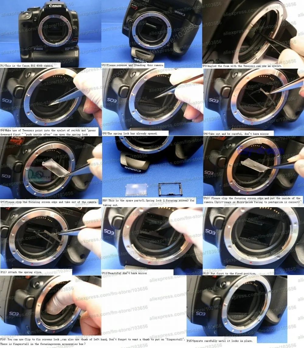 Двойной 45 градусов Сплит-изображение автофокусировка Фокус экран Легко фокусируется, особенно с вертикальными линиями объектов Введение: Легко определить, находится ли ваш предмет в фокусе при использовании автофокуса с этим разделенным экраном фокусировки изображения Простая Самостоятельная установка-не нужно брать камеру профессионалам, чтобы оплатить установку: Выключите камеру и снимите объектив; Аккуратно поместите камеру вверх дном на стабильную поверхность и с помощью пинцета извлеките металлический кронштейн изнутри камеры; Все еще используя пинцет, снимите оригинальный фокус экрана; Замените на новый Разделенный экран фокусировки изображения; Аккуратно встряхните камеру, чтобы убедиться, что экран на месте; Замените металлический кронштейн и объектив. Не влияет на способность AF камеры. Не влияет на точность фокусировки. Не влияет на яркость экрана. Если вы используете объектив ручной фокусировки или не удовлетворены точностью вашего объектива AF, этот набор разделенного экрана является лучшим инструментом, чтобы дать вам точную фокусировку. Фокусировочный экран представляет собой плоский полупрозрачный пластик с матовым покрытием и разрезом круга посередине, окруженный кольцевым полем микропризмы. Когда изображение правильно сфокусировано, круг становится полным, а линия между ними не будет сломана. В противном случае линия разделяет круг на две половинки. Этот набор состоит из разделенного экрана фокусировки изображения, одного пластикового пинцета и одного алюминиевого пинцета и двух латексных пальцевых ботинок. Пинцет позволяет легко установить экран в камеру, а пальчиковые насадки предотвращают оставление отпечатков пальцев на экране. Просты в установке. Совершенно новый и неиспользованный. Примечание: возврат не принимается после проверки фокусирующего экрана. Подходит для: Цифровые камеры Canon EOS 350D 400D Комплектация: 1x фокусировки Экран 2x Пинцет (1 алюминий + 1 пластик) 2x латексные напальчники